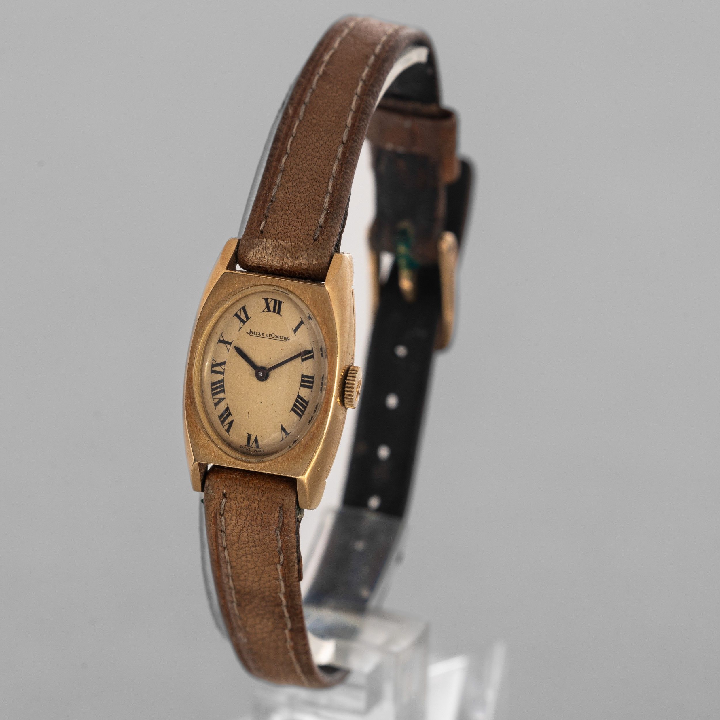 Jaeger Le Coultre Lady tonneau in oro 18k, quadrante champagne con numeri romani, carica manuale, cinturino in pelle, 20x17,5 mm, 1960 circa