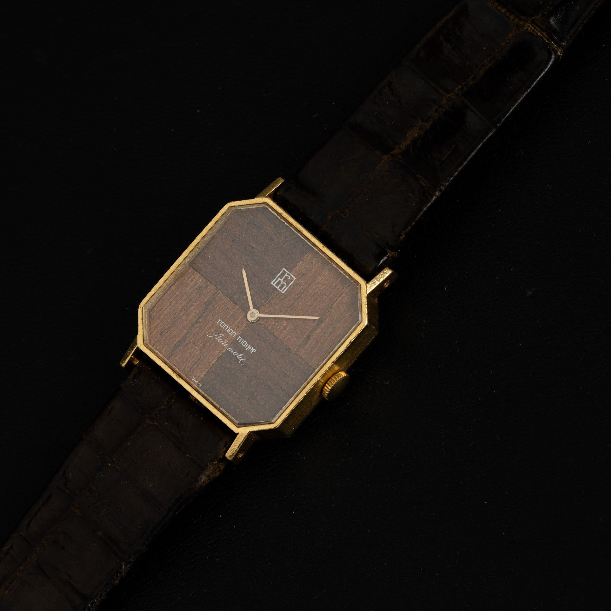 Orologio di forma automatico in oro giallo 18k quadrante in legno, 25x25 mm