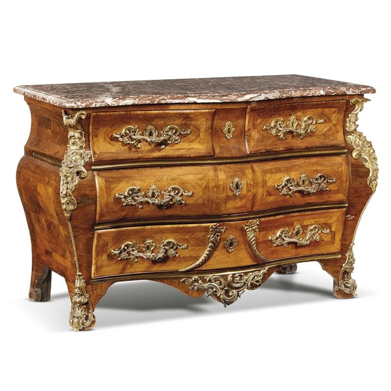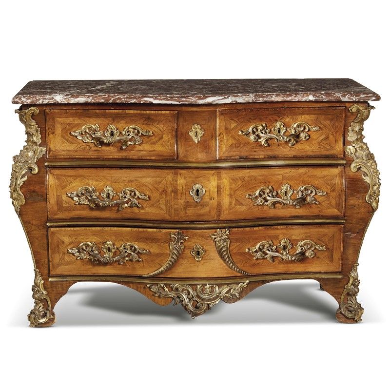 lastronato in legni vari e bois de rose con piano in marmo rosso, fronte e fianchi di linea mossa arricchiti da applicazioni in bronzo dorato ad ornare gli angoli, i cassetti e la fascia bella base, cm 85x132x62