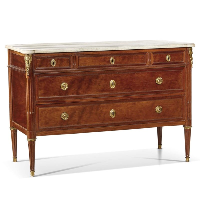 CASSETTONE, FRANCIA, SECONDA METÀ SECOLO XVIII in mogano con piano in marmo bianco stondato agli angoli, fascia superiore divisa in tre cassetti centrati da bocchette ovali in bronzo dorato, ulteriori due cassetti sottostanti con maniglie circolari ai lati e bocchetta ovale al centro, angoli scanalati, gambe troncoconiche con terminazioni in bronzo, cm 88x130x57