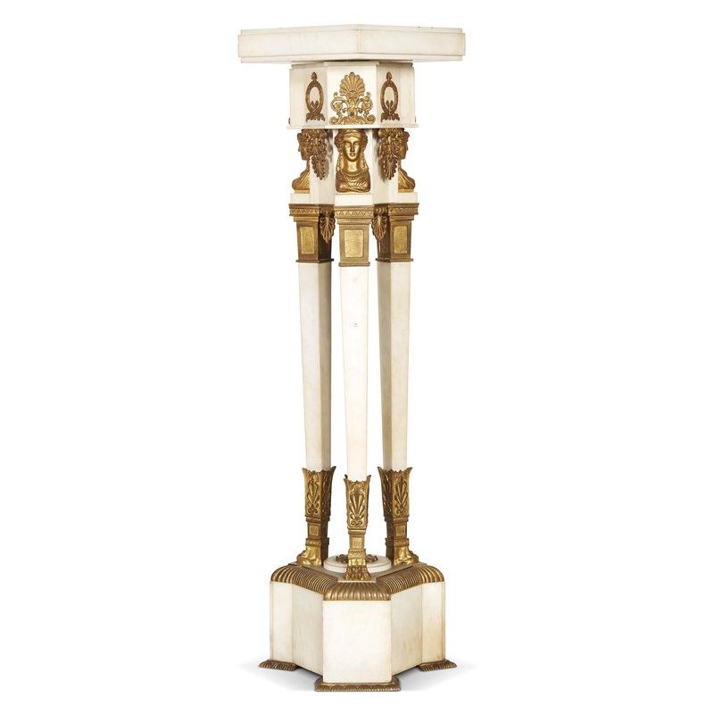 in marmo bianco e bronzo dorato, fusto costituito da tre pilastrini posti su alta base di linea spezzata, a sorreggere il piano d'appoggio girevole di forma quadrata, cm 116x30x30