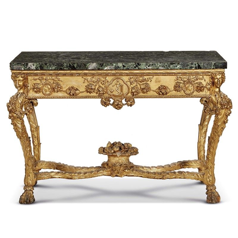 CONSOLE, ROMA, SECOLO XVIII in legno intagliato e dorato, piano lastronato in marmo verde, sotteso da ampia fascia sottostante riccamente intagliata con formella centrale polilobata raffigurante allegoria da cui si sviluppano festoni di fiori e frutti e due riserve laterali ovali raffiguranti profili; ai quattro angoli sono scolpite teste muliebri da cui si sviluppano gambe sagomate ad intagli fogliacei terminanti su piedi ferini, riunite da traverse centrate da vaso di frutta, cm 91x142x70