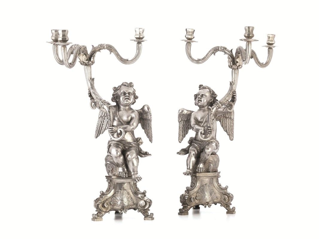 COPPIA DI CANDELABRI, NAPOLI, PROBABILMENTE ARGENTIERE GAETANO DI MARTINO, 1830 CIRCA in argento raffiguranti due putti alati nell'atto di sorreggere il braccio portacandele a tre fiamme, seduti su una nuvola poggiante su base di forma trapezioidale sagomata a rocaille; alt. cm 58, grammi 8.380