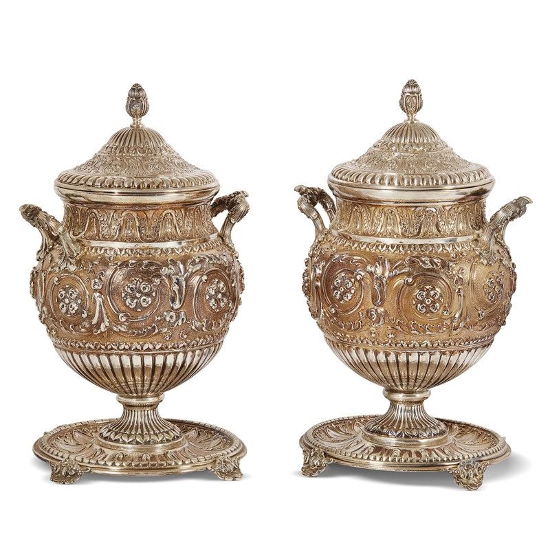 in argento su sostegni a forma di vassoio circolare poggianti su piedini a conchiglia e cesellati a foglie stilizzate rivolte verso l'esterno, piede ornato da baccellatura che prosegue sulla parte inferiore del corpo, mentre il resto del corpo è cesellato a girali fogliacei a rilievo su fondo satinato, collo ornato a foglie rivolte alternativamente in alto e in basso, due anse a tralcio fogliaceo, coperchio cesellato analogamente al corpo con presa a bocciolo, alt. cm 42, g 5340