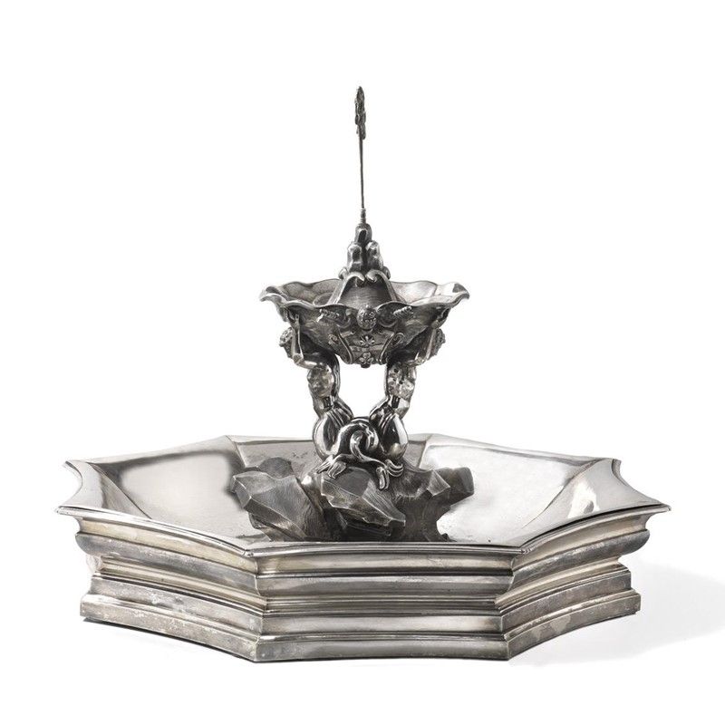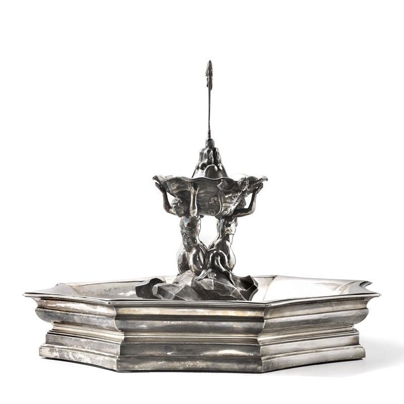 in argento raffigurante la Fontana dei Tritoni al Foro Boario a Roma, opera progettata dall'architetto Carlo Francesco Bizzaccheri nel 1717. Il progetto, che trae ispirazione dall'omonima fontana di Gian Lorenzo Bernini in piazza Barberini, fu ideata per omaggiare il committente, Papa Clemente XI, motivo per cui la vasca ebbe forma di un ottagono con i lati concavi, in modo da ricordare la stella a otto punte che caratterizzava lo stemma della famiglia Albani da cui proveniva il pontefice. Nella vasca, sopra un grande scoglio centrale si trovano due tritoni inginocchiati, scolpiti da Francesco Moratti, nell'atto di sorreggere un’ampia conchiglia a forma di ostrica con funzione di catino, sul cui bordo esterno campeggiano altri due stemmi araldici della famiglia Albani e al cui centro zampilla l’acqua; cm 55x66x66, grammi 15.730 lordi
