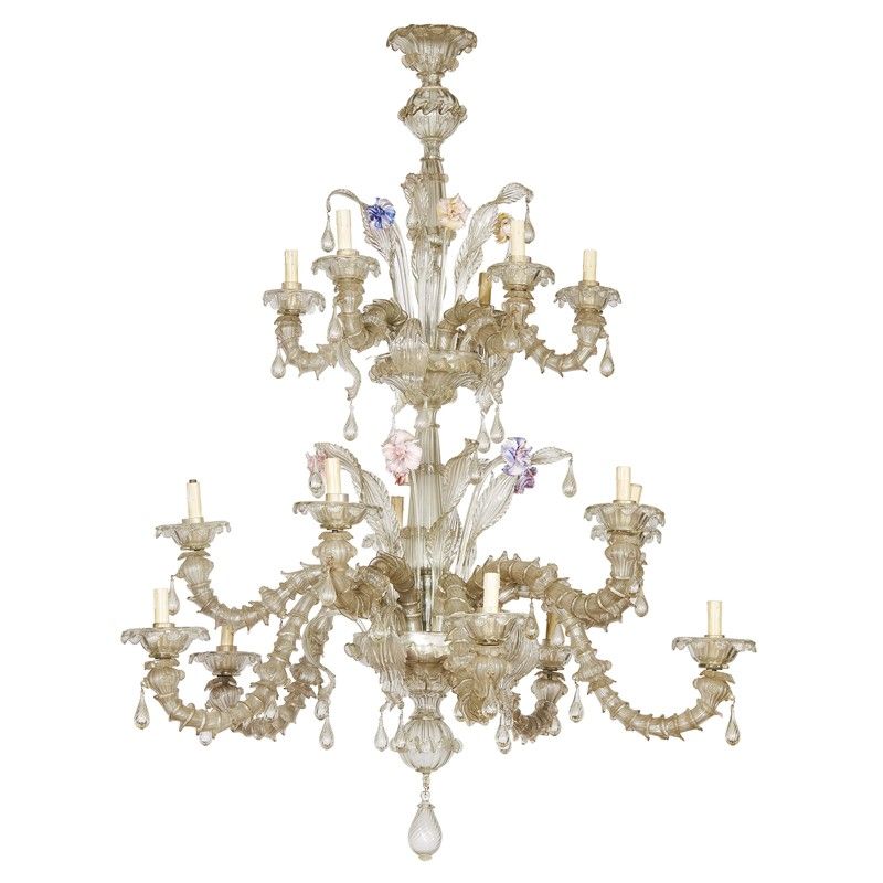 GRANDE LAMPADARIO, MURANO, SECOLO XIX in vetro incolore e policromo a doppio palco, cinque bracci portacandela ricurvi in quello superiore e dieci in quello inferiore, intervallati da fiori in vetro policromo e foglie di diversa foggia, ornati da pendenti a goccia, alt. cm 150, diam. cm 120