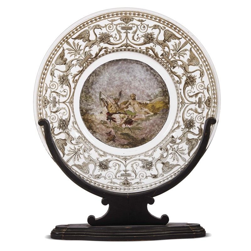 in vetro trasparente inciso a grottesche sul bordo e dipinto nel tondo centrale con scena mitologica di ispirazione tipolesca. Montato su supporto in legno ebanizzato; il piatto diam. cm 70