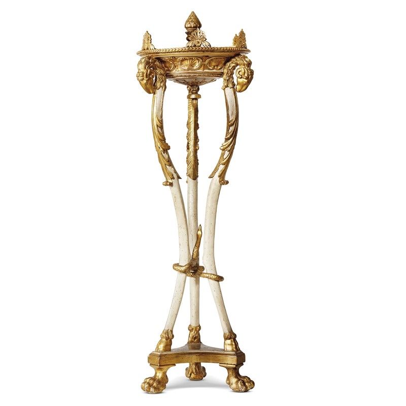 in legno intagliato, dorato e dipinto, sormontato da pigna entro vaso, ornato da palmette sull'orlo e motivo a conchiglia sulla fascia esterna, sorretto da tre elementi di linea sinuosa con teste di ariete all'estremità superiore e terminazioni a zoccoli, legate insieme da serpente attorcigliato, poggianti su base tripode sorretta da zampe leonine, cm 175x52x58