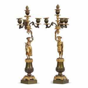 COPPIA DI CANDELABRI, FRANCIA, SECONDA METÀ SECOLO XIX in bronzo brunito e dorato, raffiguranti coppia [..]