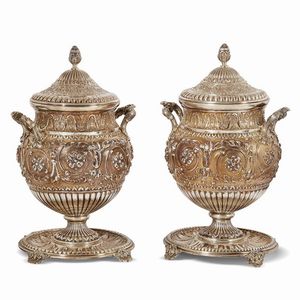 COPPIA DI VASI CON COPERCHIO, FIRENZE, SECOLO XX, ARGENTIERE ANTONIO BRAGANTI in argento su sostegni a forma di [..]
