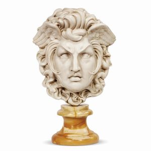 TESTA DI MEDUSA, SECOLO XX in marmo bianco, cm 39x36x16, su piedistallo circolare modanato in marmo giallo, cm [..]