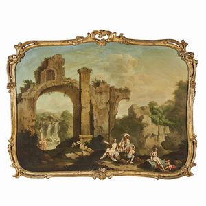 Artista del secolo XVIII CAPRICCIO CON FIGURE olio su tela sagomata, cm 106,5x141 Entro cornice in legno intagliato [..]