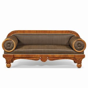 DIVANO, ITALIA CENTRALE, METÀ SECOLO XIX intagliato e filettato in legno chiaro, schienale di forma arrotondata, [..]