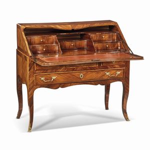 SCRITTOIO A RIBALTA, FRANCIA, SECONDA METÀ SECOLO XVIII lastronato in legno vari, maniglie e bocchette [..]