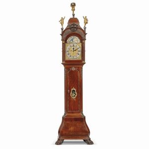 OROLOGIO A TORRE, PAESI BASSI, ULTIMO QUARTO SECOLO XVIII in mogano, cassa sormontanta da Atlante e due figure [..]