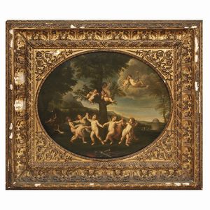 Scuola italiana, secolo XIX GIOCHI DI PUTTI olio su tavola, cm 95x116 Entro cornice in legno intagliato e dorato [..]