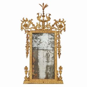 SPECCHIERA, FIRENZE, FINE SECOLO XVIII in legno intagliato e dorato, ricca cimasa sormontata da vaso di fiori [..]