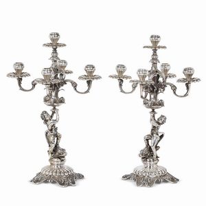 COPPIA DI CANDELABRI, MILANO, SECOLO XX in argento, fusto realizzato da due figure che cavalcano un mostro marino, [..]