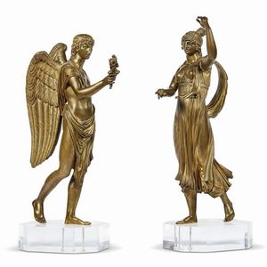 COPPIA DI FIGURE, FRANCIA, PRIMA METÀ SECOLO XIX in bronzo finemente cesellato, raffiguranti Amore e Psiche, [..]