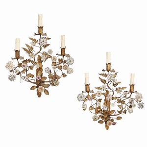 COPPIA DI GIRANDOLES, INGHILTERRA, SECOLO XIX in cristallo, bronzo e porcellana, a due luci su base con fregio [..]