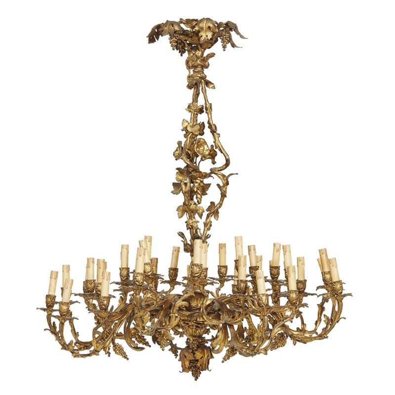 LAMPADARIO, FINE SECOLO XIX in bronzo dorato, finemente lavorato ad imitare tralci di vite e grappoli d’uva e arricchitro da fiori lungo il fusto, a trentadue luci che si estendono orizzontalmente, desinente in finale a grappolo d'uva racchiuso da foglie di vite; alt. cm 128, diam. cm 118