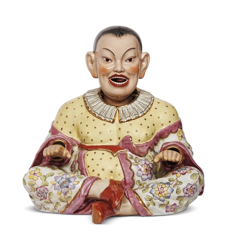 MAGOT, GERMANIA, FINE SECOLO XIX in porcellana policroma, raffigurante figura cinese seduta a gambe incrociate, veste gialla con colletto dai profili dorati e mantella con decori floreali cinta in vita da cintura rossa, con testa, lingua e mani basculanti, cm 45x48x40