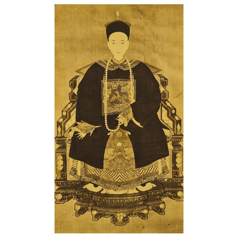 su tavola, raffigurante dignitario cinese in trono, che indossa abito tradizionale, copricapo e lunga collana di perle, su fondo giallo oro, cm 160x89,5