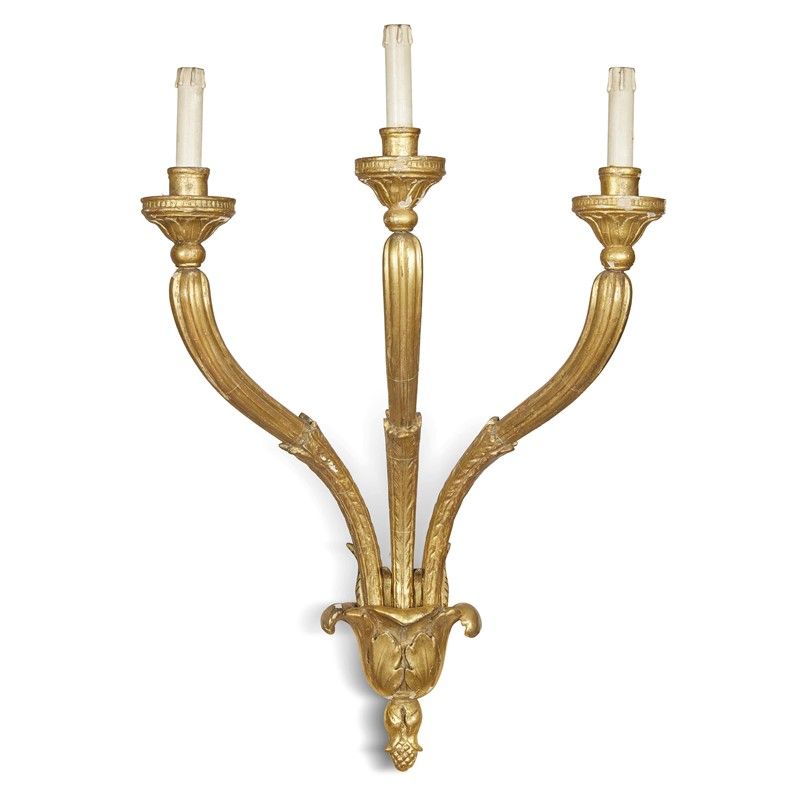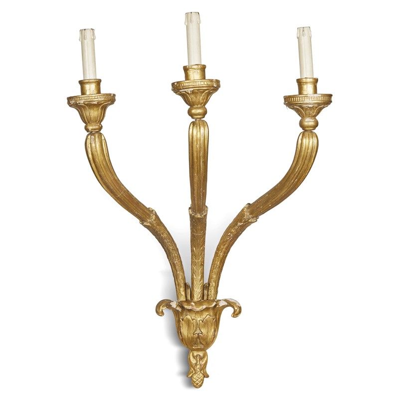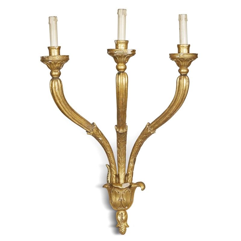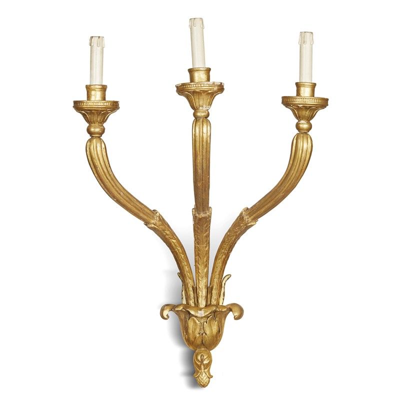 in legno intagliato e dorato, a tre bracci di linea mossa decorati a racemi e scanalature che si dipartono da motivo centrale a bocciolo per terminare in piattello circolare, montate a elettricità, cm 72x48
