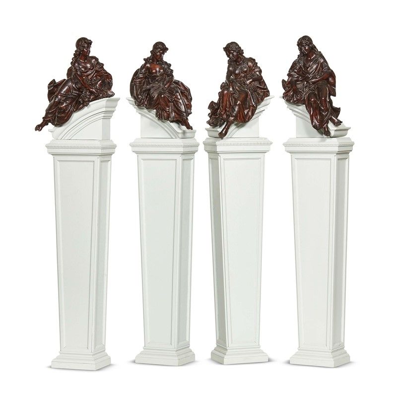 QUATTRO STAGIONI, ITALIA SETTENTRIONALE, FINE SECOLO XVIII sculture legno patinato raffiguranti allegorie delle quattro stagioni, alt. cm 60 circa ciascuna; montate su basi a pilastro moderne in legno dipinto in color azzurro polvere, alt. cm 185 circa (complessivamente)