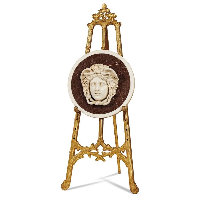 in marmo bianco e rosso di forma circolare centrato da rilievo con testa di Medusa, completo di sostegno a cavalletto in legno intagliato e dorato; tondo diametro cm 53, cavalletto cm 150x61x65