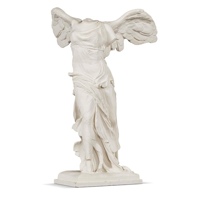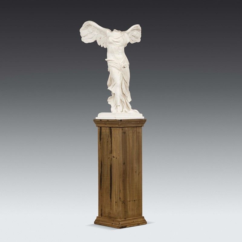 in gesso raffigurante la Nike di Samotracia dal modello classico, cm 95x70x82; su colonna in legno dipinto, cm 100x36x36