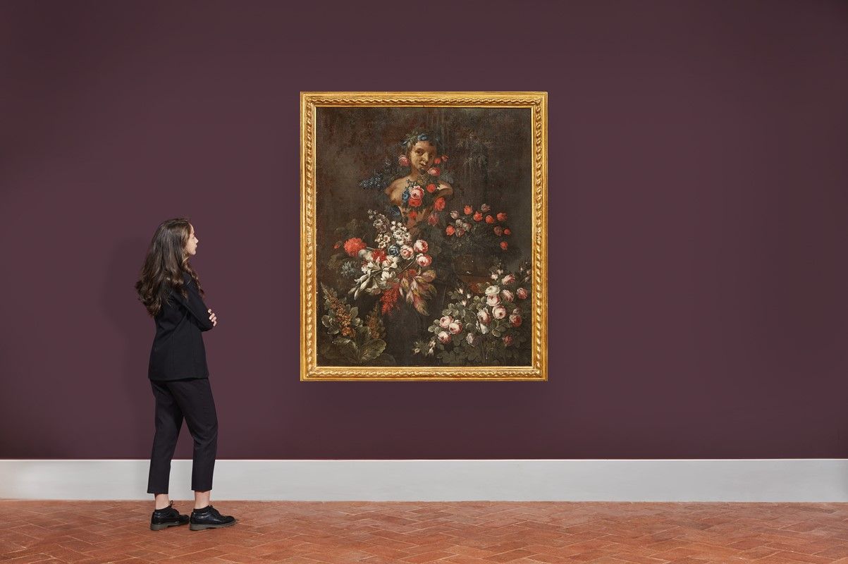 NATURA MORTA CON FIORI E STATUA CLASSICA