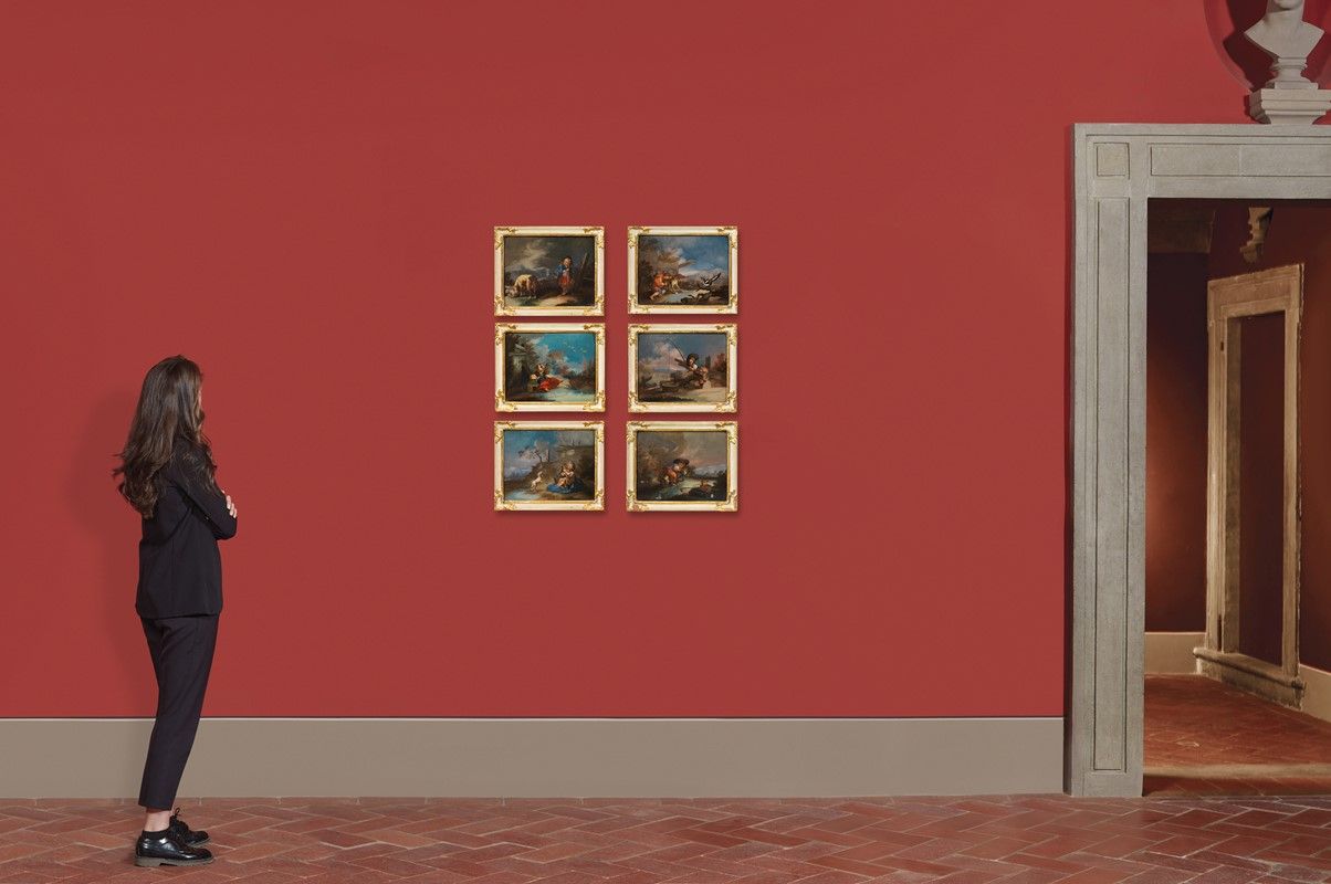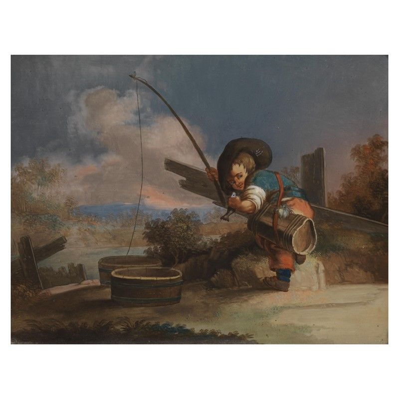 Scuola veneta secolo XVIII SCENE AGRESTI CON CONTADINELLI sei dipinti ad olio su vetro, cm 25x31 ciascuno Entro cornici in legno intagliato, laccato e dorato