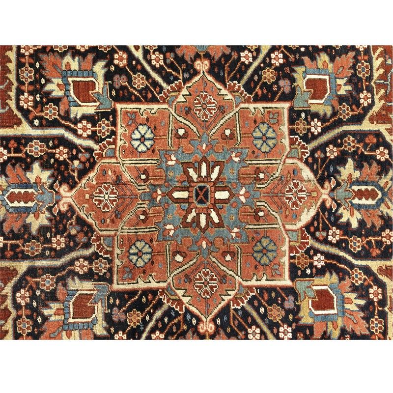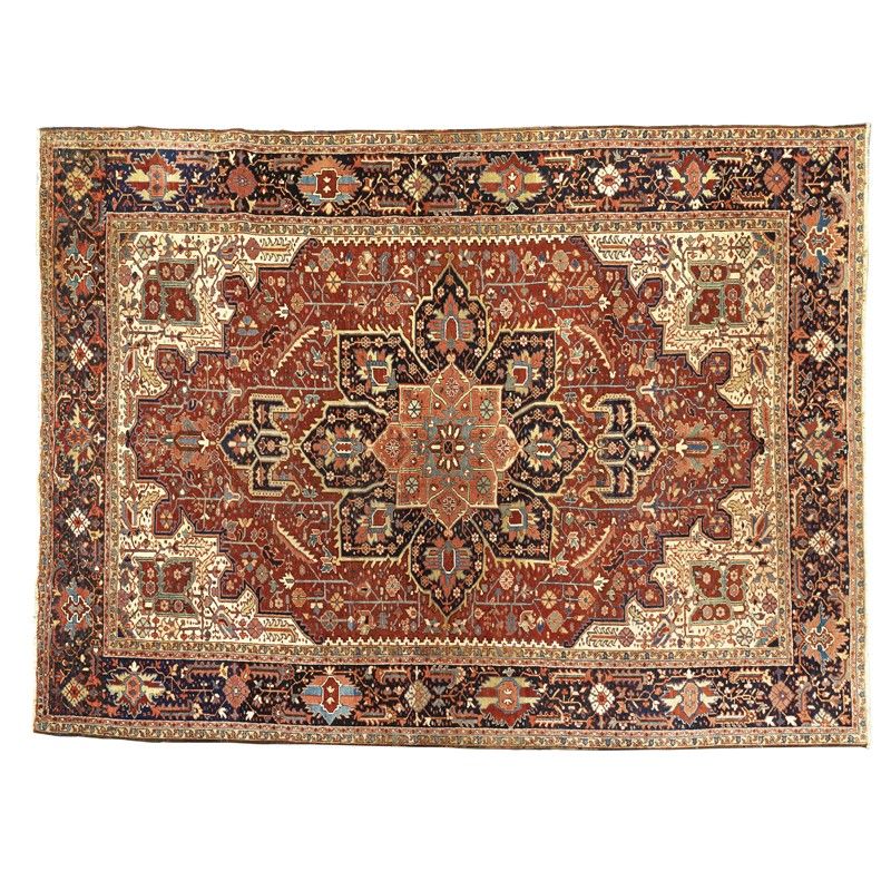TAPPETO HERIZ SERAPHI, PERSIA SETTENTRIONALE, FINE SECOLO XIX a fondo rosso mattone, con medaglione blu e riquadri color avorio, bordura blu con decori a foglia policroma, cm 395x295