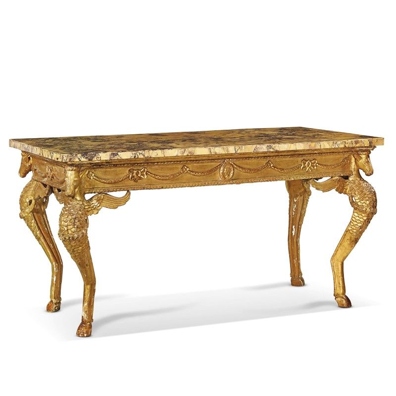 TAVOLO DA CENTRO, ROMA, METÀ SECOLO XVIII in legno intagliato e dorato con piano di forma rettangolare in marmo giallo. Fascia decorata con intaglio a festone fermato da nastri, fiori e medaglione centrale, su gambe sagomate a forma di ariete alato su piedi a zoccolo, cm 85x160x78