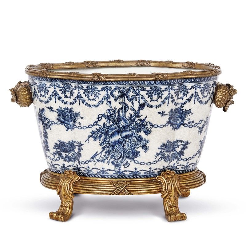 in porcellana bianca decorata in monocromia blu a motivo floreale e trofei, con bordo superiore, prese a motivo di frutta e base con quattro piedi ferini in bronzo dorato, cm 28x43x30,5