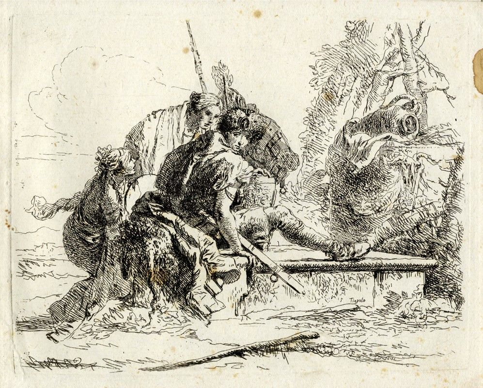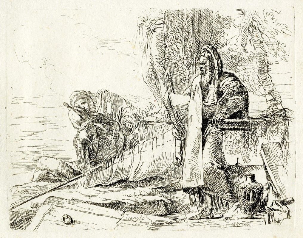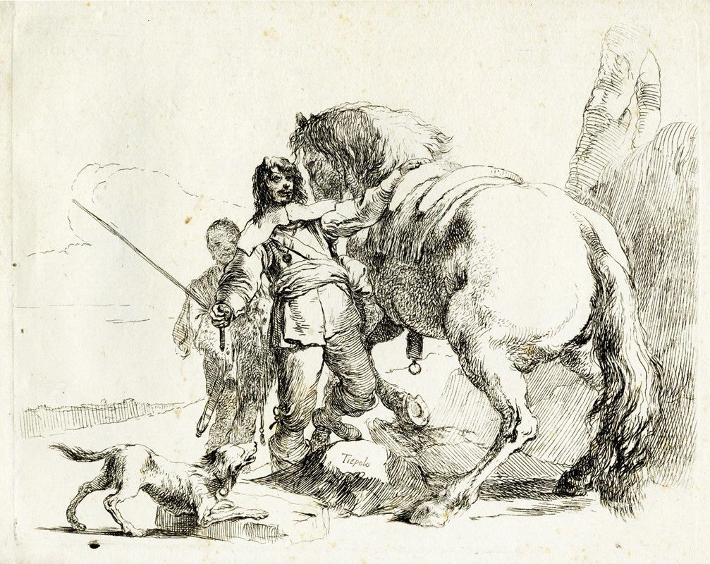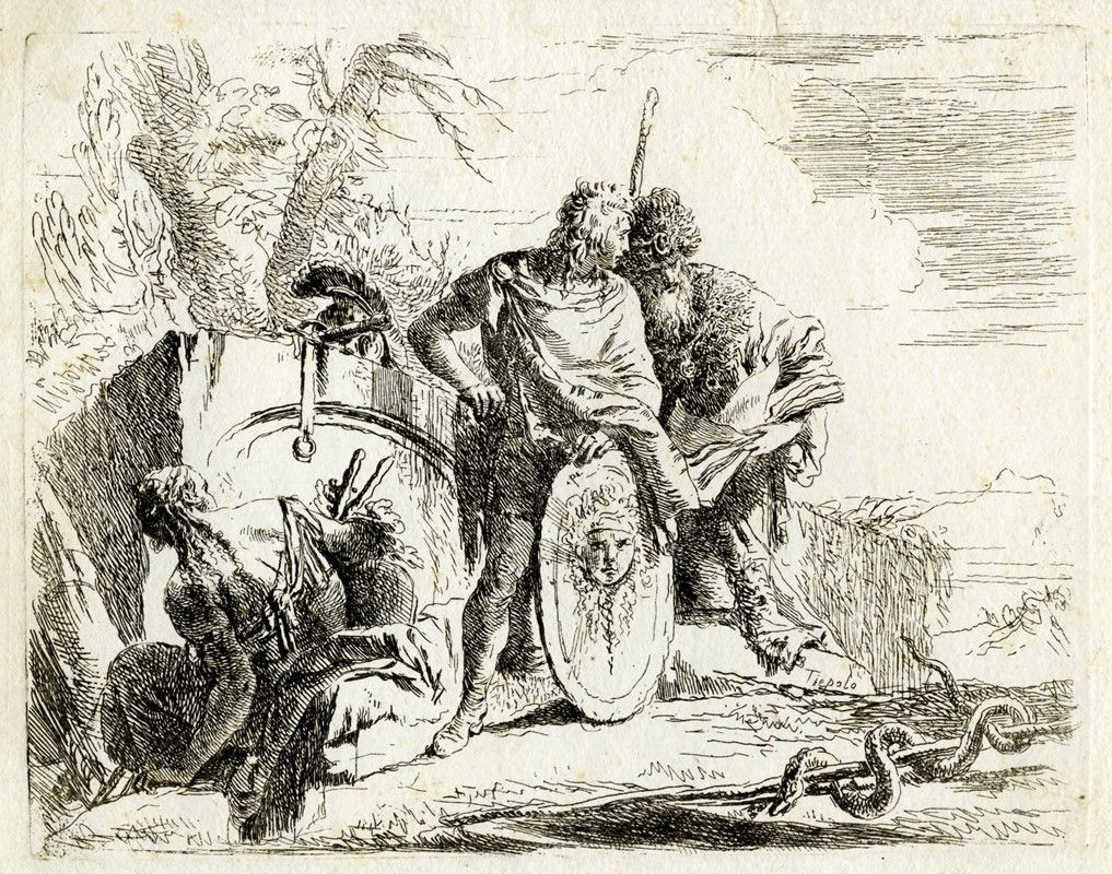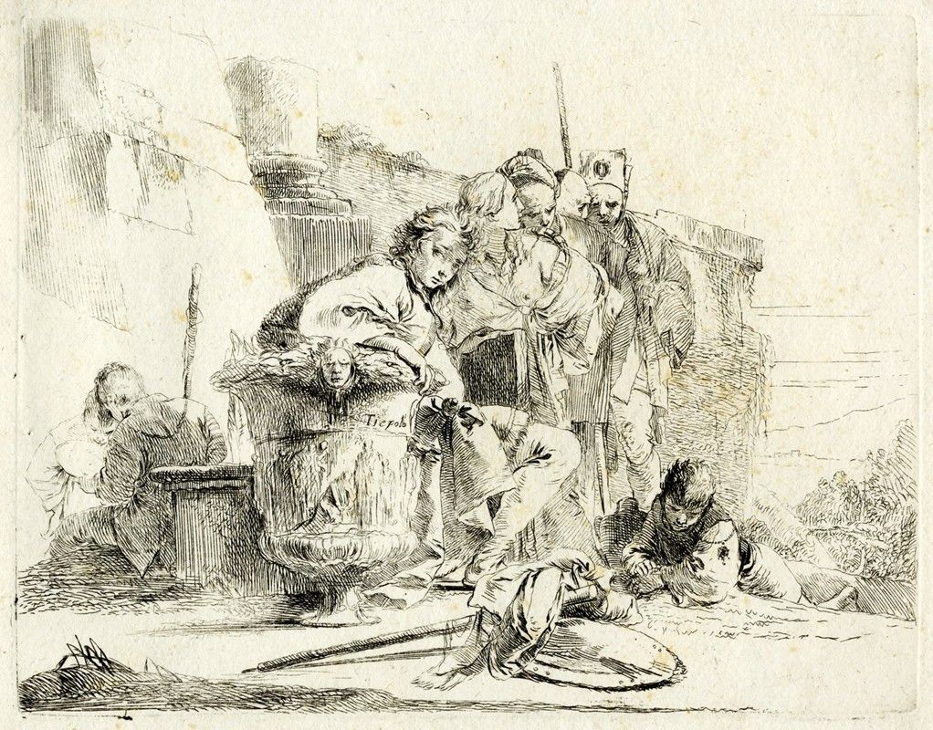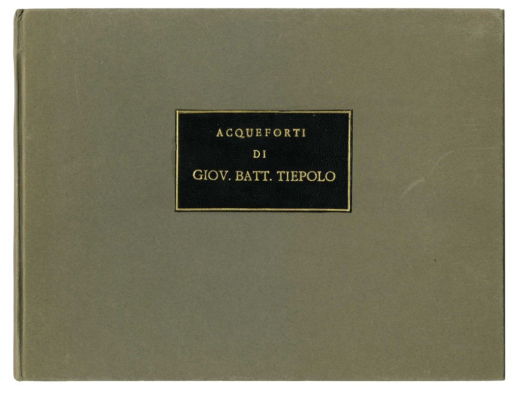 Album in-8° oblungo (mm 162x210) contenente sei tavole all'acquaforte non omogenee dai Capricci (mm 132/140x172/190. Foglio: mm 146/153x185). DeVesme, 3, 5, 7, 8, 11, 12. Rizzi (1971), 29, 31, 33, 34, 37, 38. La serie completa dei Capricci si compone di dieci incisioni eseguite da Giovanni Battista tra il 1739 e il 1743 (più recentemente J. Rutgers propone una data di esecuzione tra il 1733 e il 1735) e pubblicata per la prima volta da Anton Maria Zanetti nel secondo volume della terza edizione della sua Raccolta di varie stampe a chiaroscuro...in Venezia MDCCXLIX. I Capricci vennero pubblicati nuovamente in edizione autonoma e dedicata a Girolamo Manfrin nel 1785. Bellissime impressioni nell'unico stato su carta vergellata spessa (solo De Vesme, 5 su carta vergellata sottile) priva di filigrana. Legatura in cartonato grigio con tassello in pelle nera e iscrizione in oro "Acqueforti / di / Giov. Batt.Tiepolo" al piatto anteriore. Provenienza: collezione Tammaro De Marinis.
