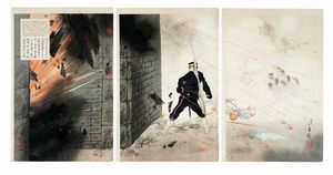 1895 Xilografia a colori (nishiki-e). Formato: trittico ôban tate-e verticale (mm 365x720). Firma: [..]