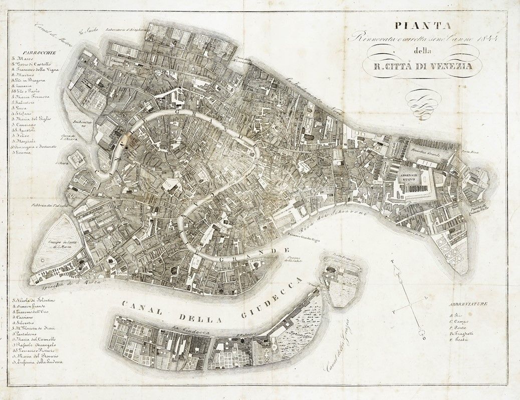 Litografia a colori. mm 450x590. SI AGGIUNGONO: Carta della Laguna di Venezia rilievi eseguiti a tutto 1931 preceduta da un cenno storico sulla laguna dettato da Giuseppe Pavanello. Venezia: Litografia del R. Magistrato alle acque, 1931. Esemplare "1015". Con custodia e completa di opuscolo. Mappa in tre carte separate e ripiegate. mm 405x560 ciascuna / Pianta rinnovata e corretta sino l'anno 1844 della R. Città di Venezia. mm 350x455.