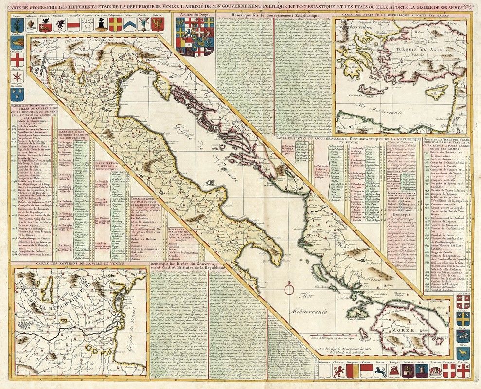 Incisione in rame in coloritura. mm 503x624. Foglio: mm 548x665. Da Atlas Historique, ou Nouvelle Introduction A l'Histoire, à la Chronologie & à la Geographie Ancienne & Moderne; ... Tome III. Qui comprend la Grande Bretagne, l'Irlande, la Suisse, la Savoye, La Loraine & la Republique de Venise., Amsterdam, 1708. Rappresentazione della parte centrale dello stivale con tutto il versante est, il Golfo di Venezia, l'Istria, la Dalmazia, l'Albania e la Morea. In basso a sinistra riquadro con Carte des environs del la Ville de Venise e in alto a destra altro con Carte des etats où la Republique a porté ses Armes. Gran parte della tavola è dedicata al vasto elenco delle vittorie della Serenissima.