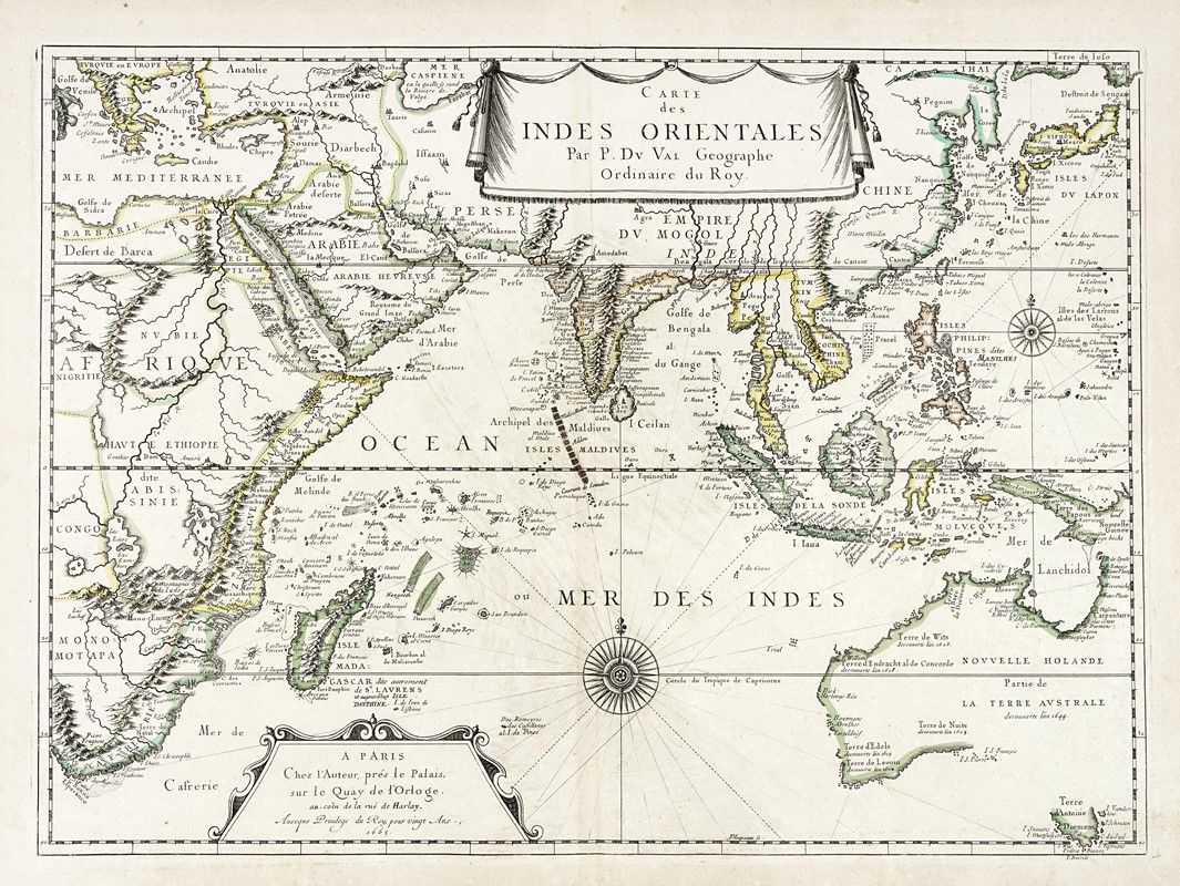Incisione in rame in coloritura. mm 400x548. Foglio: mm 454x595. Mappa pubblicata in prima edizione nel 1665, dall'atlante di Duval Cartes de Geographie les Plus Nouvelles, raffigurante l'Oceano Indiano, dall'Australia e dal Sud Africa alla Cina e all'Asia Minore. Tra le prime mappe francesi a riportare le scoperte del XVII secolo in Australia, soprattutto le scoperte di Abel Tasman seguite ai suoi viaggi in Australia e Nuova Zelanda, dal 1642 al 1644. Vi sono rappresentati gli arcipelaghi dell'India orientale dell'Indonesia e delle Filippine e l'intera area tra il Capo di Buona Speranza e il Giappone e l'Australia, con la Tasmania che forma il limite meridionale a est. La mappa mostra anche le precedenti scoperte di Hartog, Cartensz e Nuyts in Australia. India, Indocina e penisola malese sono raffigurate sulla base delle carte nautiche olandesi del periodo. La forma dell'arcipelago indonesiano è in qualche modo corretta, non ancora la Nuova Guinea. Cina e Corea sono basate sui modelli di Thevenot.