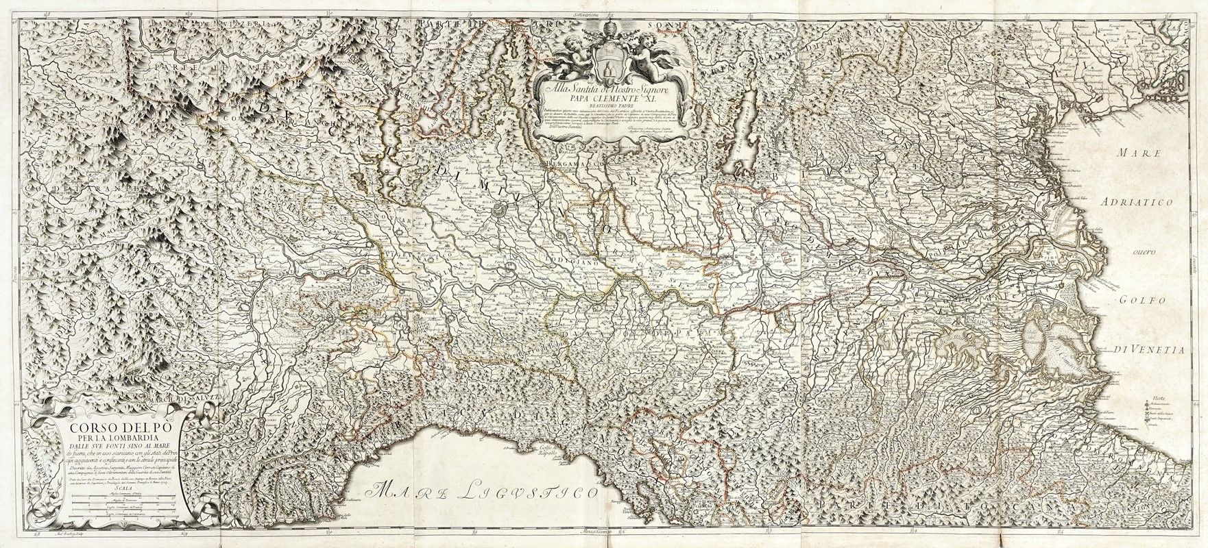 Incisione in rame con confini in coloritura. mm 580x1205. Foglio: mm 610x1225. Grande mappa su tre fogli uniti che riporta l’intero Corso del Po attraverso l’Italia settentrionale, e basata sui rilevamenti del cartografo militare Agostino Cerruti. In basso a sinistra il cartiglio contenente il titolo,le responsabilità autoriali ed editoriali e la data "1703". Seguono quattro scale in miglia d’Italia e di Piemonte e in leghe di Francia e di Germania. Sotto al cartiglio, sulla cornice graduata la firma dell’incisore: “Ant.o Barbey Sculp.” In alto al centro della seconda lastra troviamo un secondo cartiglio sormontato dallo stemma papale sorretto da due putti con la dedica del Cerruti a Papa Clemente XI. Accurata rappresentazione delle montagne, con indicazione delle fonti dei fiumi e delle relative valli, ottima la toponomastica con l’inserimento di moltissime località anche minori. Alcuni esemplari di questa mappa presentano un quarto foglio a destra, aggiunto posteriormente dal De Rossi, raffigurante l’Istria, che seppur non più attinente con il titolo “Corso del Po” chiude il Golfo di Venezia.