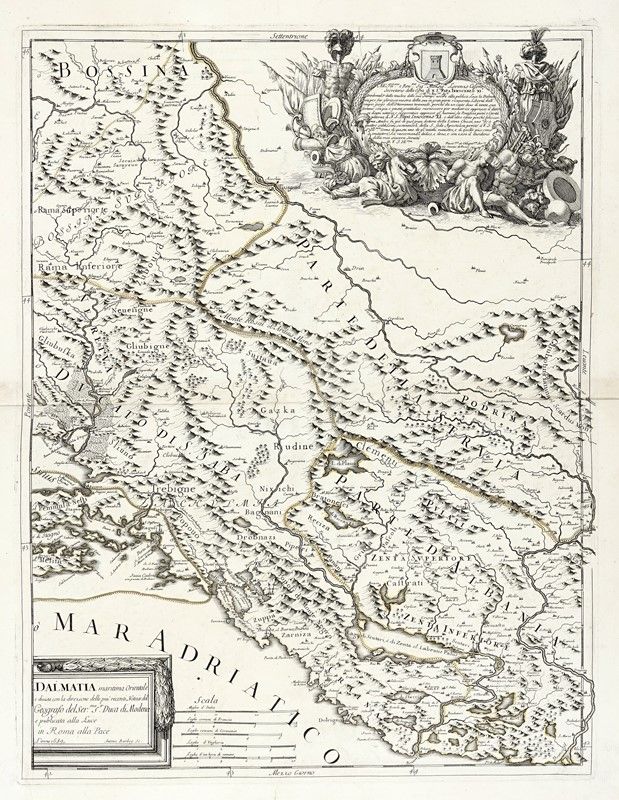 Incisione in rame con confini in coloritura. Ciascuna tavola: mm 555x424/427. Foglio: mm 614x478. Grande carta della costa dalmata in due tavole. Da Mercurio geografico overo Guida Geografica in tutte le parti del Mondo conforme le Tavole Geografiche del Sansone Baudran de Cantelli Data in luce con direttione, e cura di Gio. Giacomo de Rossi nella sua stamperia, raccolta di carte edita a Roma tra il 1660 ed il 1730 dalla tipografia De Rossi - la datazione delle carte va dal 1669 al 1715 - la cui prima stesura si deve a Giovanni Giacomo de Rossi. Alla tavola di destra in alto dedica del De Rossi a monsignor Lorenzo Casoni segretario di Papa Innocenzo XI, e in basso la scala miliaria; al centro distribuita tra le due tavole, tabella festonata con il titolo e le responsabilità autoriali ed editoriali, presente la firma dell'incisore Antonio Barbey (notizie 1689-1703). Alla mappa di sinistra, in basso la tavola delle concordanze toponomastiche. La carta è graduata su tutto il perimetro, sia nel senso della latitudine, che nel senso della longitudine.