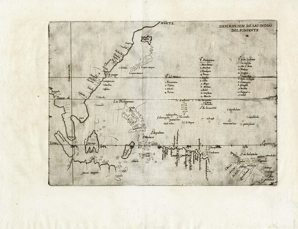 mm 205x280. Foglio: mm 295x400. Con il titolo sulla lastra in alto a destra. Dalla I edizione di Descripcion d[e] las Indias Ocidentales de Antonio de Herrera Coronista Mayor de su Magd de las Indias y su coronista de Castilla... En Mad[rid]: en la Emplenta Real [sic]: por Juan Flamenco, 1601. Rara mappa della Cina, del Sud-Est asiatico, delle Filippine, del Giappone, con anche la costa settentrionale della Nuova Guinea e le Isole Salomone. La mappa di Herrera è una delle prime a mostrare la regione e basata esclusivamente su fonti spagnole: redatta sulle carte manoscritte di Juan Lopez de Velasco risalenti al 1575 - 1580 circa. Come è tipico delle mappe spagnole pubblicate prima del 1750, a causa della politica ufficiale spagnola di segretezza riguardo alle colonie, vengono forniti pochissimi dettagli rispetto alla topografia, ai luoghi e ai nomi delle città. Bellissima impressione, come per le mappe ai numeri precedenti, stampata con evidente tonalità su carta vergellata sottile con filigrana spagnola "croce in ovale su lettere".