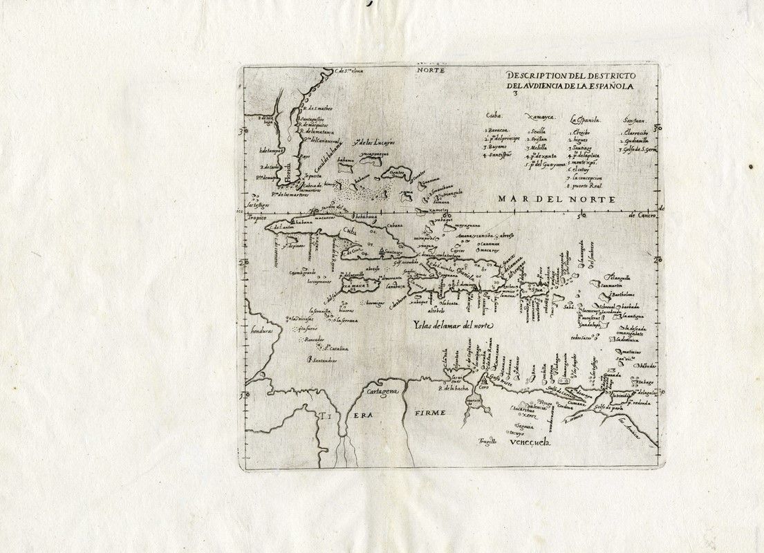 Incisione in rame. mm 209x218. Foglio: mm 297x405. Con il titolo sulla lastra in alto a destra. Dalla I edizione di Descripcion d[e] las Indias Ocidentales de Antonio de Herrera Coronista Mayor de su Magd de las Indias y su coronista de Castilla... En Mad[rid]: en la Emplenta Real [sic]: por Juan Flamenco, 1601. Mappa che raffigura il Mar dei Caraibi, l'America centrale e la parte Nord del Sudamerica, sono delineate anche Cuba, le Bahamas, Hispaniola e Porto Rico con dettagli e l'inserimento di toponimi.