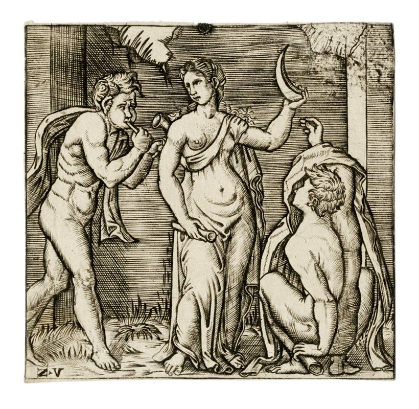 Bulino. mm 83x85. Nagler, V, 2124. Versione in controparte di una incisione di Marcantonio Raimondi (TIB 27/14, 354) da un soggetto verosimilmente di Francesco Francia. Incisore della prima metà del XVI secolo a tuttoggi non identificato, nel catalogo della collezione Malaspina il monogramma viene ritenuto di Zoan Andrea. Ottima prova impressa con inchiostrazione uniforme e piena su carta vergellata sottile priva di filigrana.