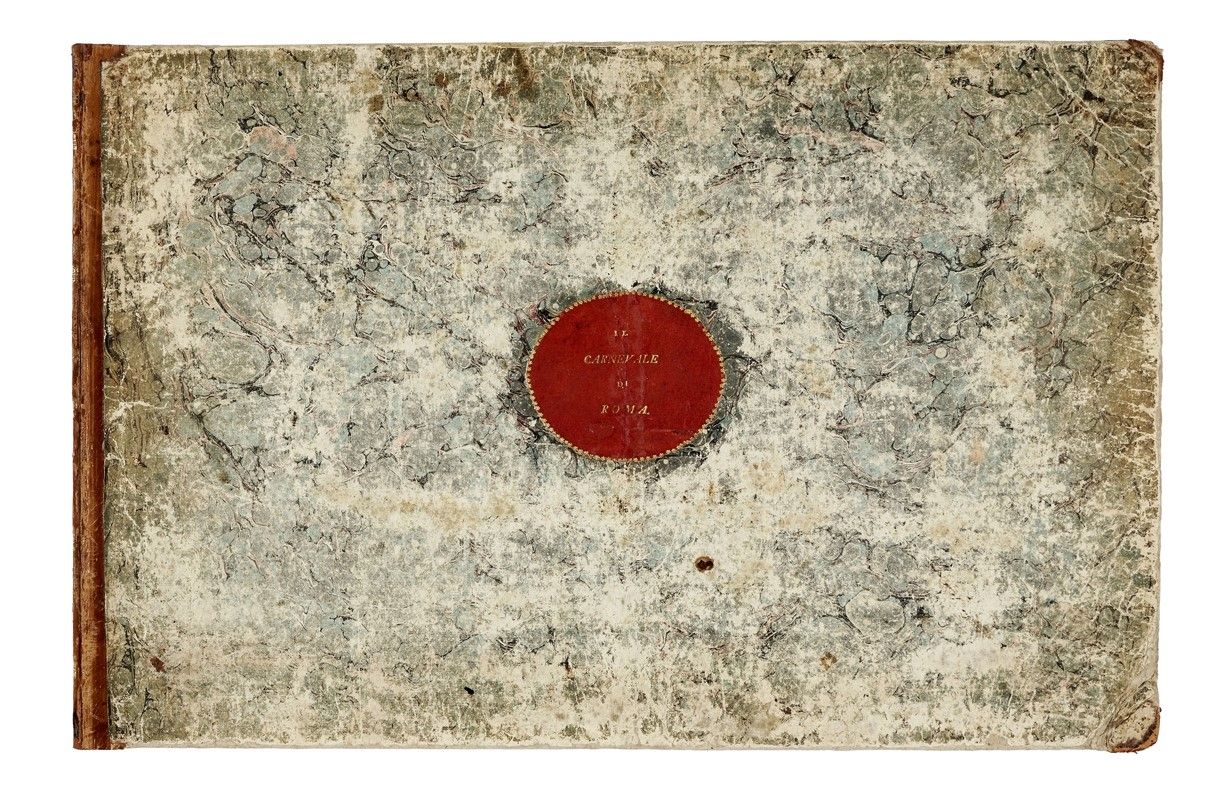 In-folio oblungo (mm 364x560). Album composto da 1 carta bianca con in alto a destra a penna e inchiostro bruno nota di possesso "Carl Joh. Sjunggren"; frontespizio, 1 c. (descrizione delle tavole), 20 tavole numerate incise all'acquaforte e acquerellate a posteriori (in basso a sinistra sulla prima tavola la firma dell'Autore e la data "H. Morner fec. Roma 1820"); legatura coeva in mezza pelle e carta marmorizzata, al piatto anteriore tassello in pelle rossa con titolo in oro (tracce d'uso, abrasioni e difetti al dorso e alle punte). Prima edizione. Le tavole, ciascuna con il titolo al centro del margine inferiore, raffigurano momenti del Carnevale di Roma fermati dall'artista, il conte svedese Karel Gustaf Hjalmar Moerner, in Piazza del Popolo e lungo la via del Corso. Colas, 530. Lipperheide, 2864.