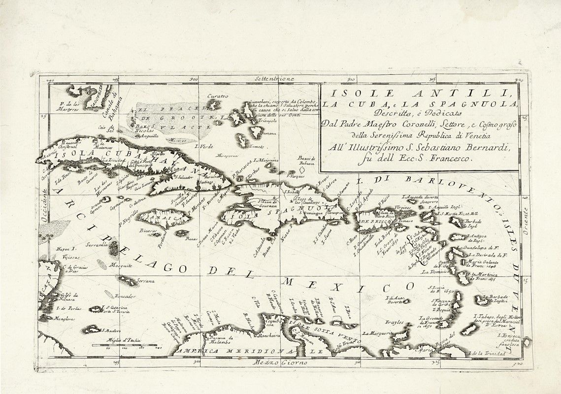 Incisione in rame. mm 260x437. Foglio: mm 365x520. Da Corso geografico Universale, o sia la terra divisa nelle sue parti e subdistinta ne' suoi gran regni... opera pubblicata per la prima volta a Venezia a spese dell'Autore nel 1692. Mappa dei Caraibi dall'estrema punta meridionale della Florida e del canale di Bahama fino alle Antille e a Trinidad. Include le Isole Cayman, le Isole Vergini e le piccole isole sulla costa del Messico,