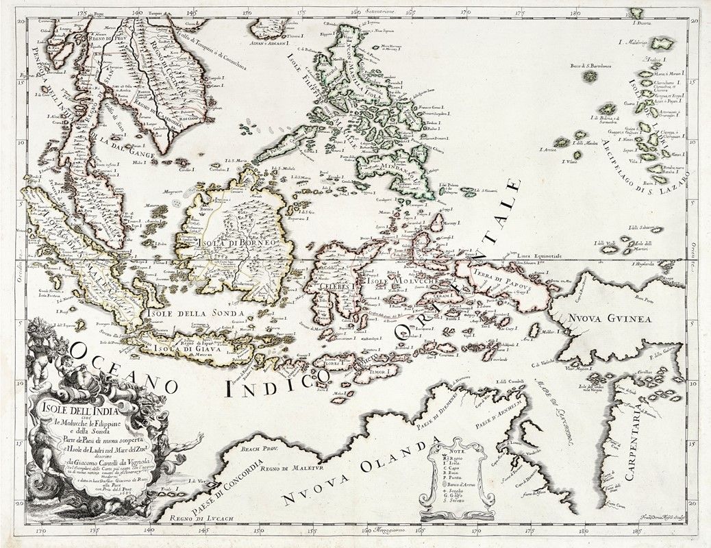 Incisione in rame in coloritura. mm 452x583. Foglio: mm 470x610. Sulla lastra in basso a destra "Franc.us Donia Messis. Sculp.". Dal Mercurio geografico. Mappa dell'Australia settentrionale e delle isole della Melanesia e del Sud-est asiatico, vi sono raffigurate la Malesia (Penisola di Malacca), Sumatra, Giava, Celebes, Nuova Guinea e Nuova Olanda (Australia). Include le nuove scoperte di Tasman nel nord dell'Australia, ma conserva alcune delle prime ipotetiche province associate alla costa nordoccidentale. Cartiglio molto decorativo per il titolo con tritoni e putti.