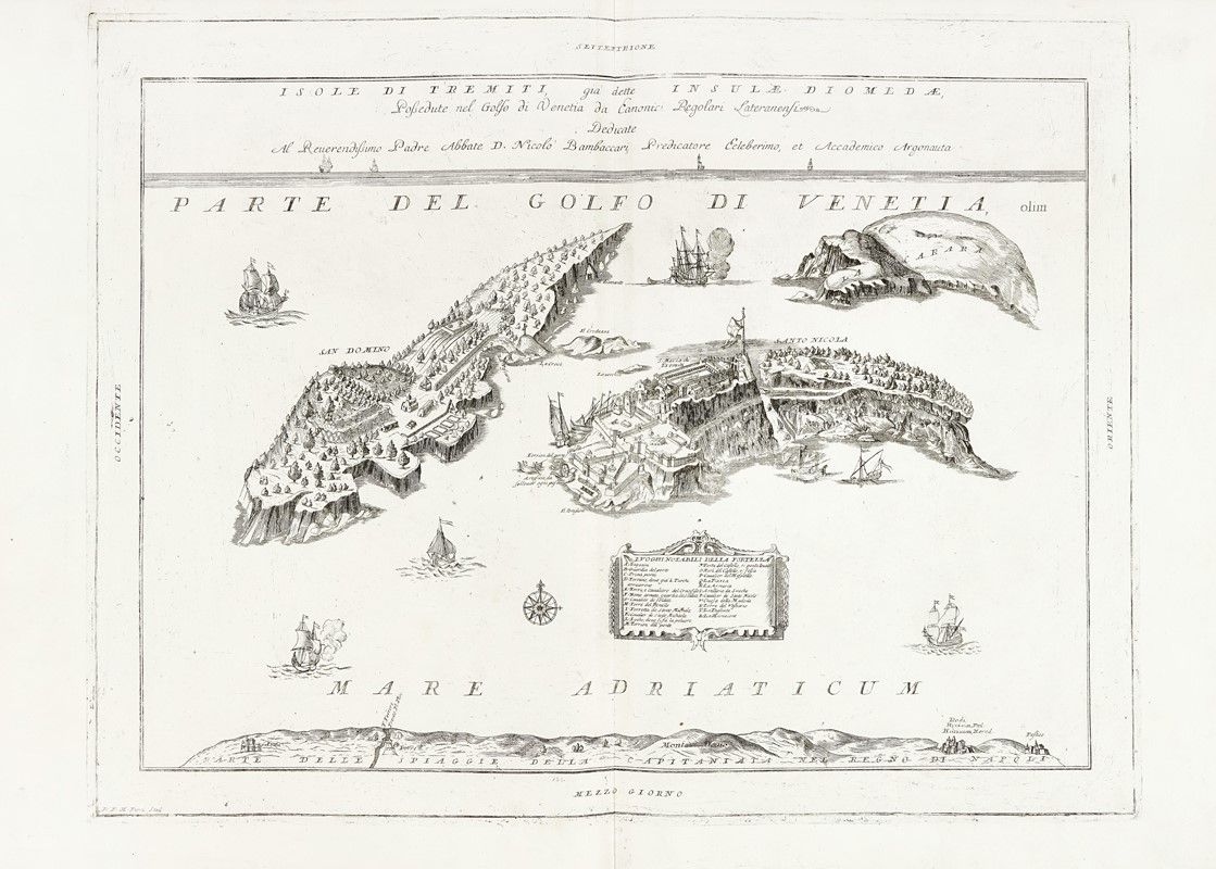 Incisione in rame. mm 440x585. Foglio: mm 495x705. Da Isolario Descrittione Geografico-Historica, Sacro-Profano, Antico-Moderna, Politica, Naturale e Poetica ... di Tutti l'Isole ... Tomo II dell'Atlante Veneto ... del P. Maestro Vincenzo Coronelli ... Venezia, 1696. Mappa delle Isole Tremiti con san Nicola, Capraia e San Domino, dedicata al "Revenderissimo Padre Abbate D. Nicolò Bambaccari, predicatore celeberrimo, et Accademico Argonauta".